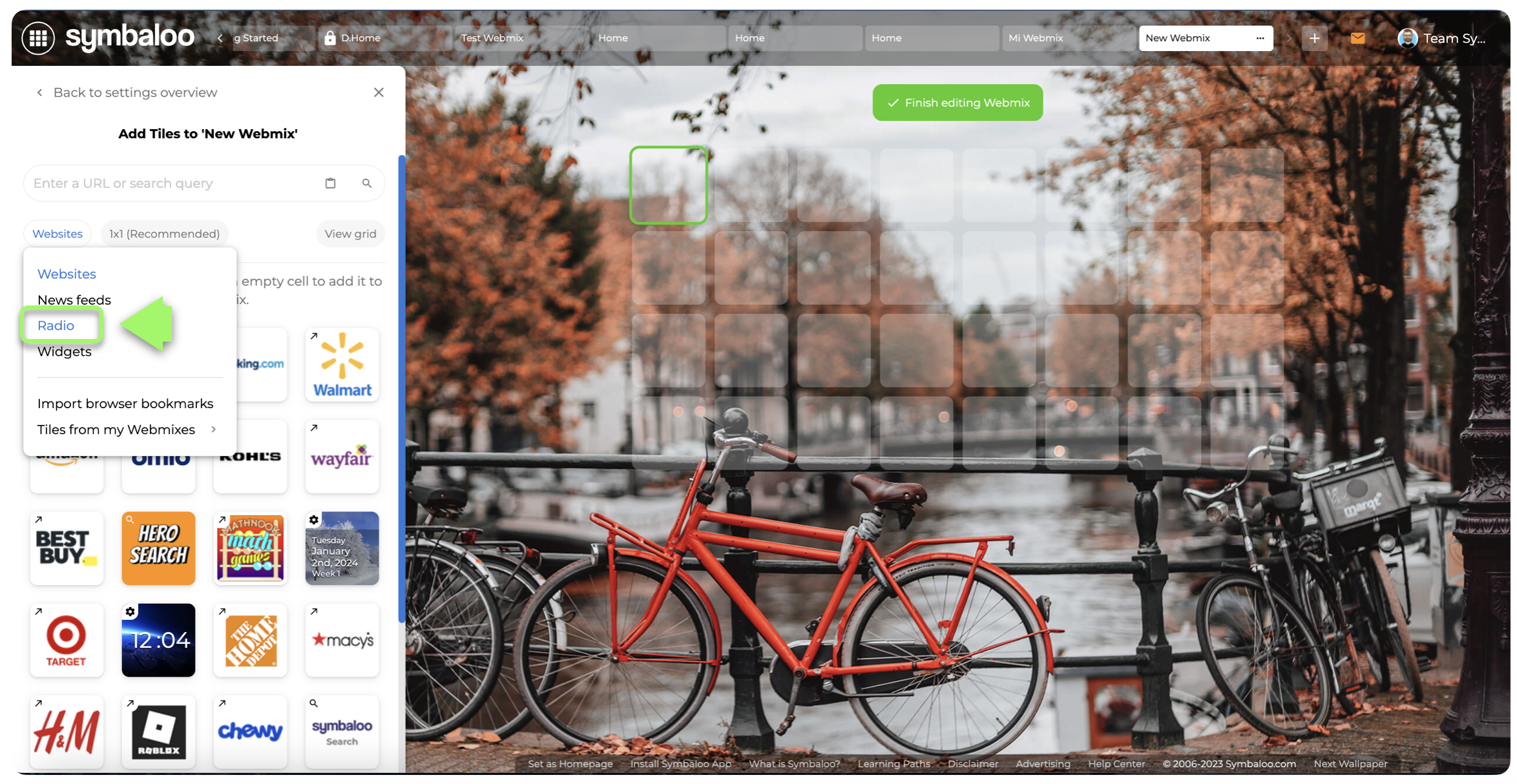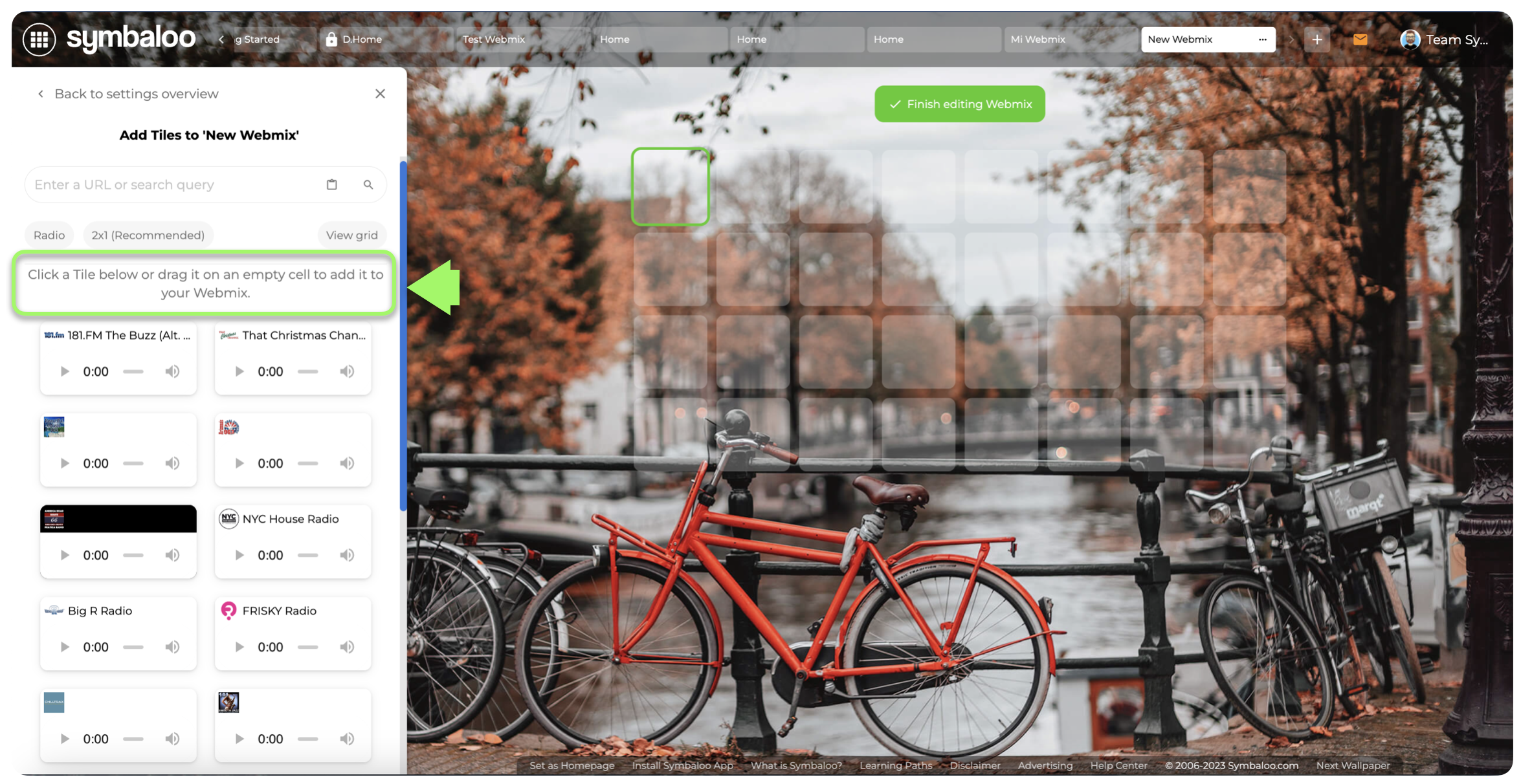 If after adding your desired Radio(s) You do not have enough space to add more, Your Symbaloo will display the "Change Webmix Size" button, so you can add more space if you need it.